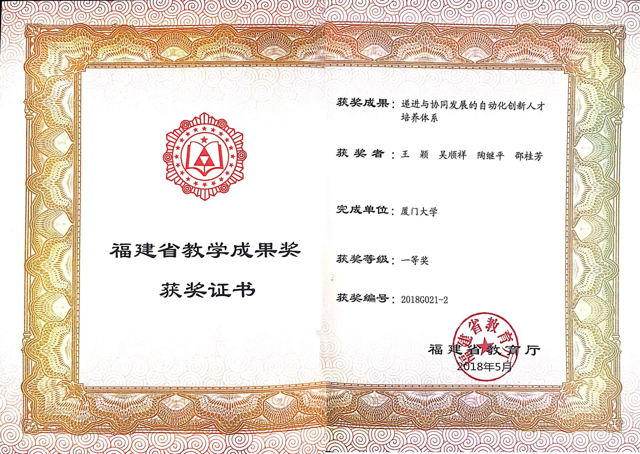 通过多年的思考积累和实践探索,王颖老师与团队构建出独具特色的自动化专业人才培养体系。她们的教学成果《递进与协同发展的自动化创新人才培养体系》不仅荣获福建省教学成果一等奖,更在2024年助力团队获评“福建省课程思政教学名师团队”称号。