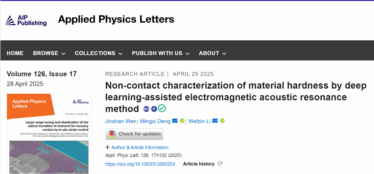 近期,厦门大学航空航天学院李卫彬教授团队及其合作者的题为“Non-contact characterization of material hardness by deep learning-assisted electromagnetic acoustic resonance method”的研究论文,发表在美国物理学联合会出版社(AIP)旗下应用物理学经典期刊Applied Physics Letters,并被编委推荐(Editor’s Pick)为Featured Article。该研究成果被美国物理学联合会《科学之光》(AIP Scilight)专访报道。