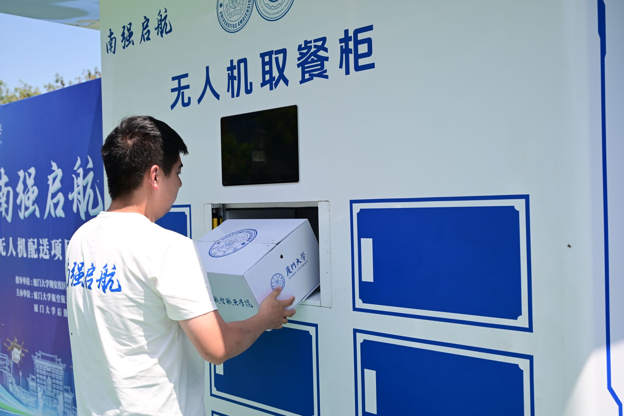 随后,厦门大学“南强启航”校园无人机配送项目正式启动。一架执行配送首飞任务的无人机满载美食,从厦门大学翔安校区俊海浩韵学生广场腾空而起,沿着预定航线平稳飞行,精准降落到目的地航空航天学院大楼后院的食物接收柜,用户扫码、取餐柜自动出餐,配送任务仅用时3分钟,大幅提升运输效率,直观展现出低空经济发展的独特优势。