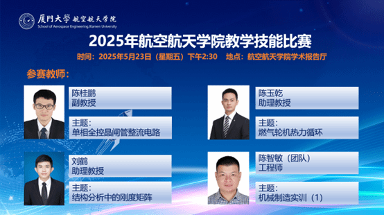 为深入贯彻新时代教育方针,大力弘扬教育家精神,着力提升教师队伍专业素养,助力新入职教师快速成长,5月23日下午,航空航天学院在院楼547报告厅举行2025年教学技能比赛。本次比赛以“精技强师启航未来,协同创新共筑金课”为主题,特邀教师发展中心吴正云教授、教授级高工林育兹、张洪奎教授及本科教学督导黄保和等专家莅临指导。陈桂鹏、陈玉乾、刘鹤、陈智敏等教师及其团队参赛,比赛由学院教学支撑中心副主任蔡志钦主持。