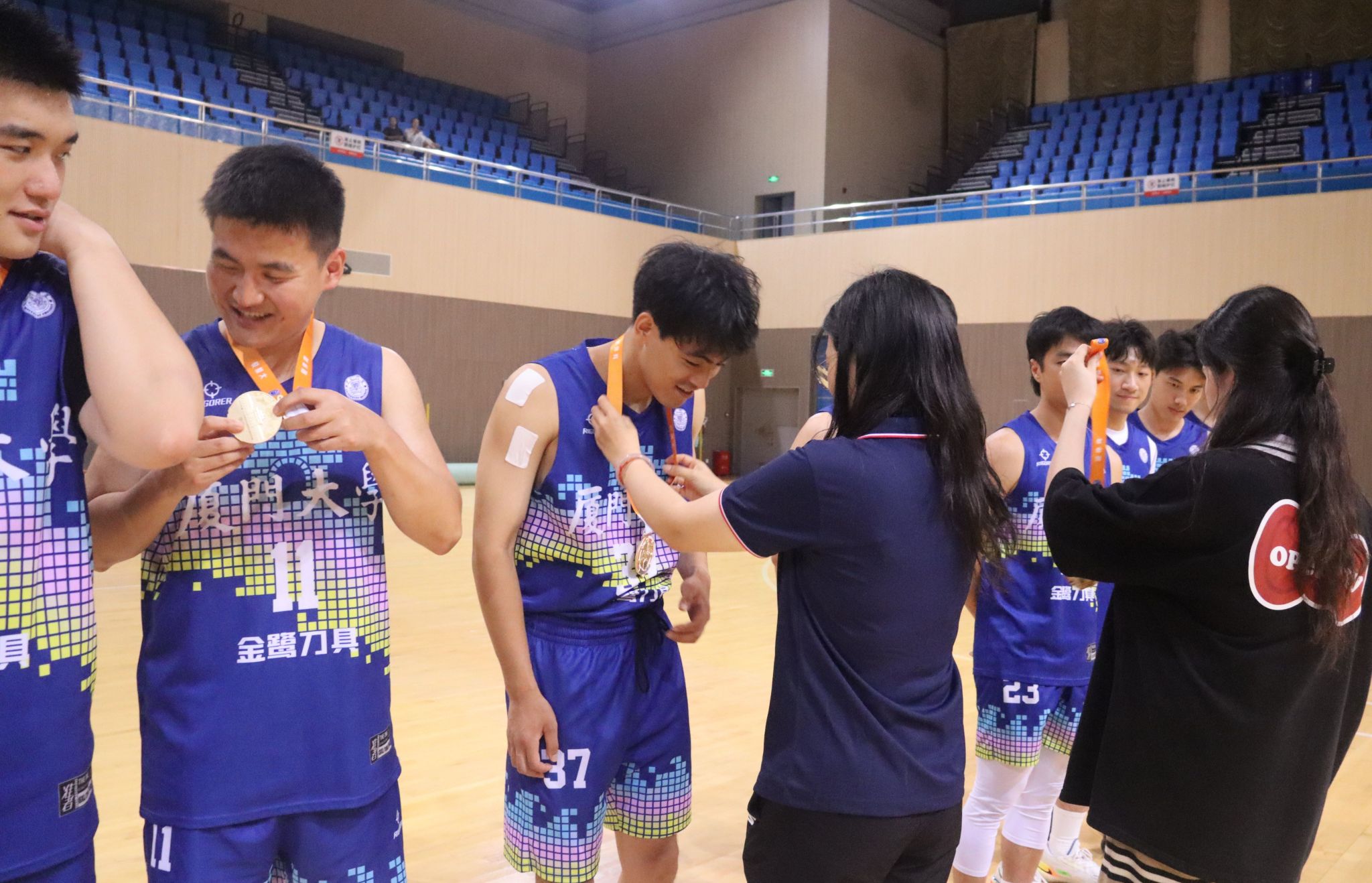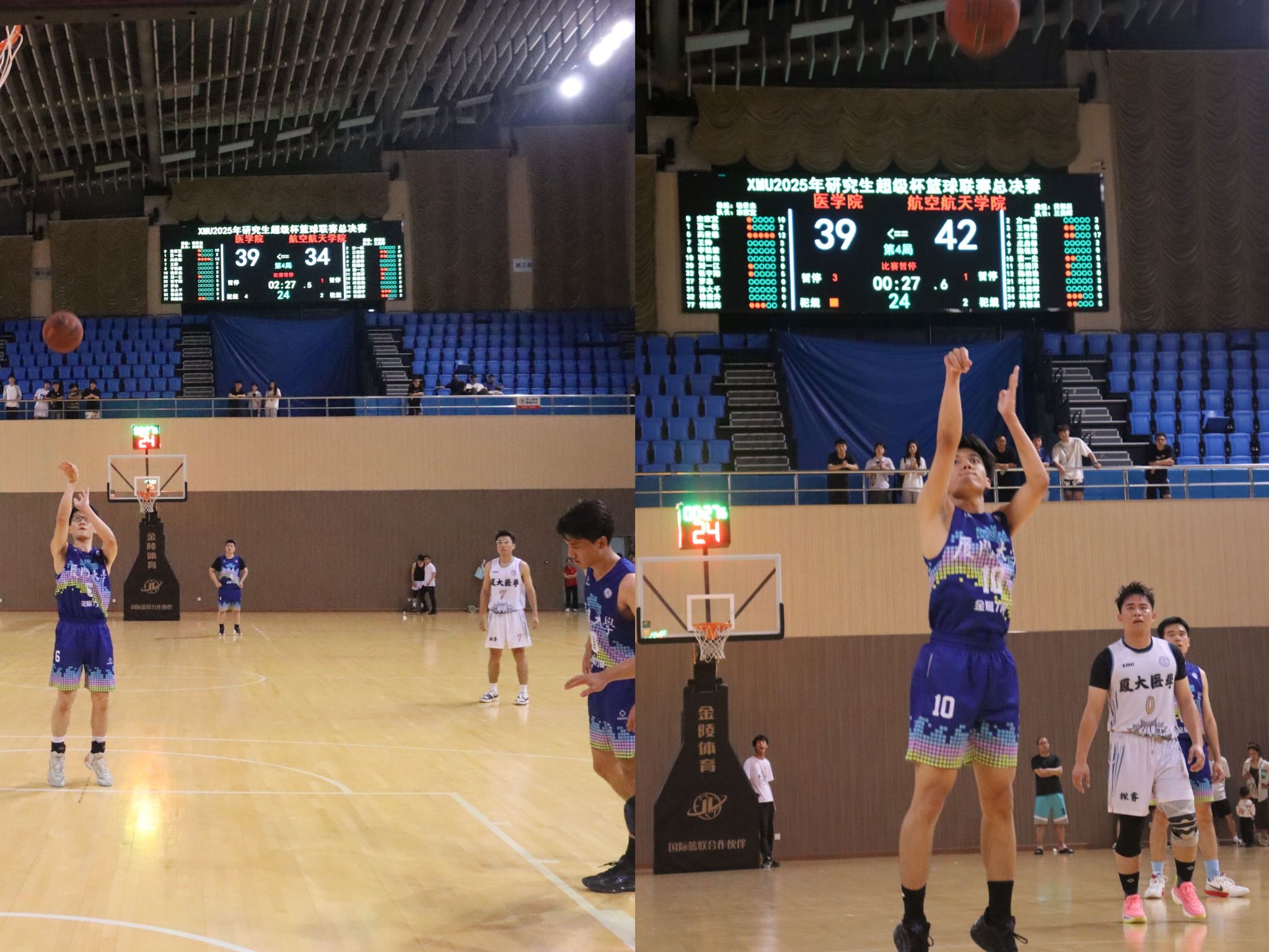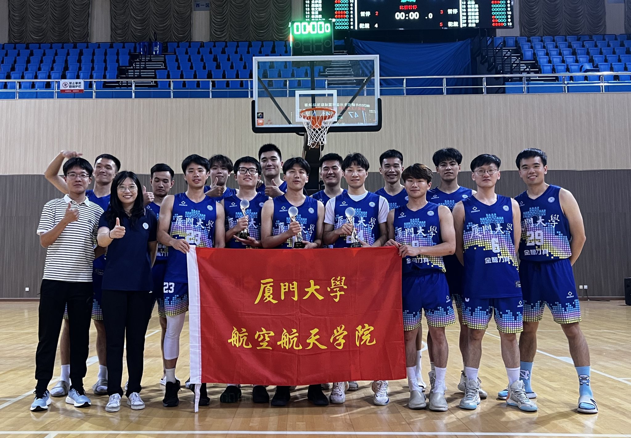 6月8日晚,厦门大学2025年研究生“超级杯”篮球联赛男篮季军争夺战在翔安校区爱秋体育馆激情上演。航空航天学院男篮在大比分落后的逆境中展现顽强斗志,以42:39力克医学院男篮,捧起季军奖杯。学院团委书记郭江淮、团委副书记董佳闻全程观赛助威,董佳闻为球队颁发季军奖牌。