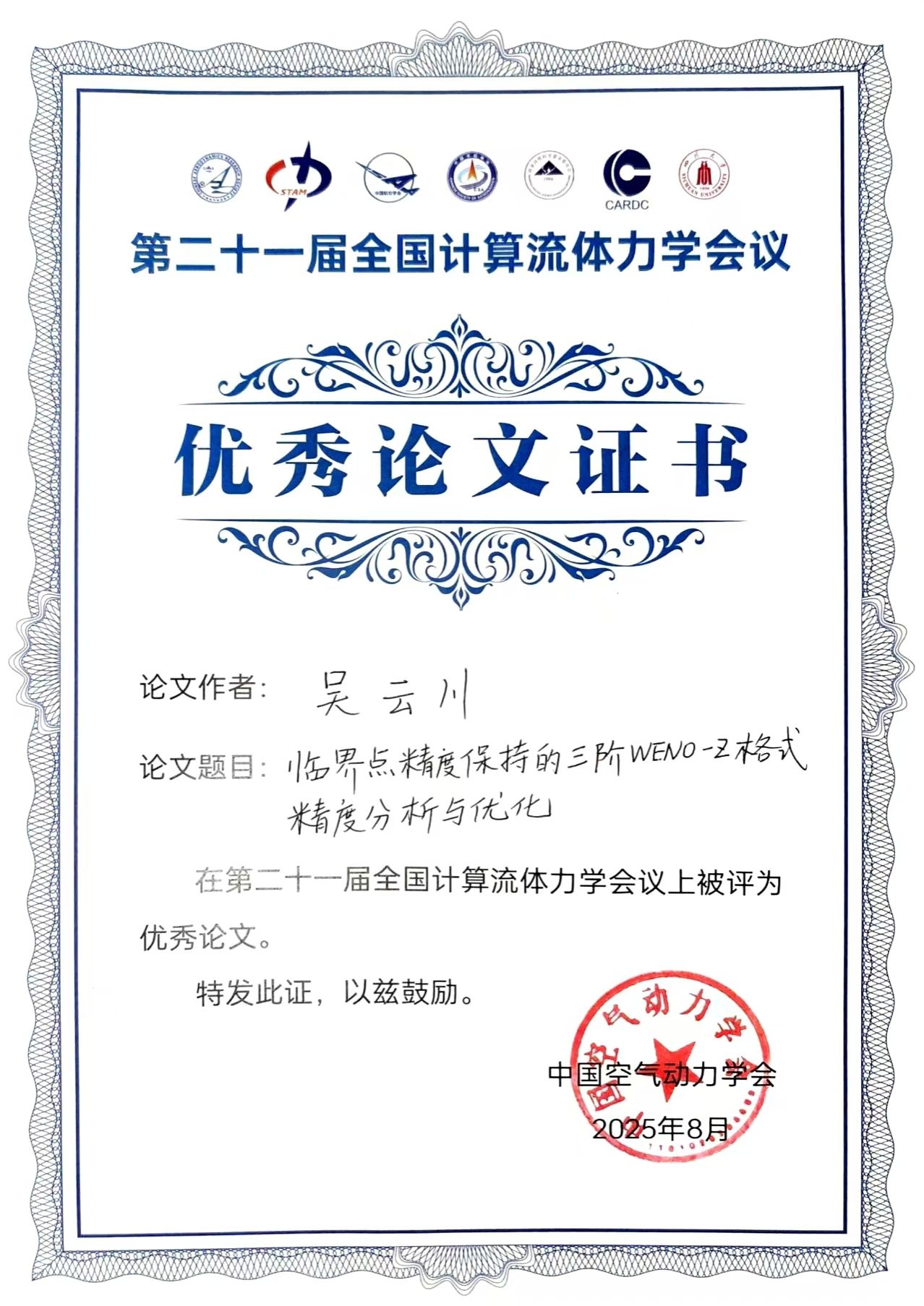 在第二十一届全国计算流体力学会议上,厦门大学航空航天学院李沁教授课题组2024级硕士生吴云川在会上做了题为《临界点精度保持的三阶WENO-Z格式精度分析与优化》的报告,并荣获CFD数值格式会场“优秀论文奖”。该报告介绍了课题组关于WENO-Z格式临界点精度恢复与分辨率优化的最新研究进展:提出了一种精度优化引理,给出了一种提高归一化非线性权精度的途径并进一步基于该引理确定了光滑度量因子;在此基础上开展了针对相关参数的理论分析并提出关于局部光滑度量因子中参数对分辨率影响的引理,结合数值实验进一步确定了格式中的参数取值,最后在保持稳定性和尺度无关的前提下提出了一种提升分辨率的改进格式,并应用多种典型算例充分验证了改进格式的精度、分辨率与稳定性。