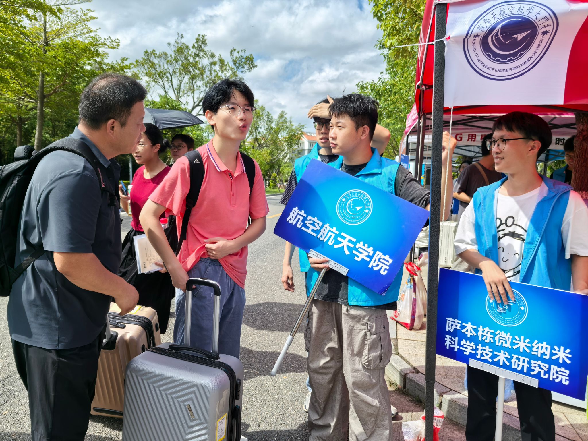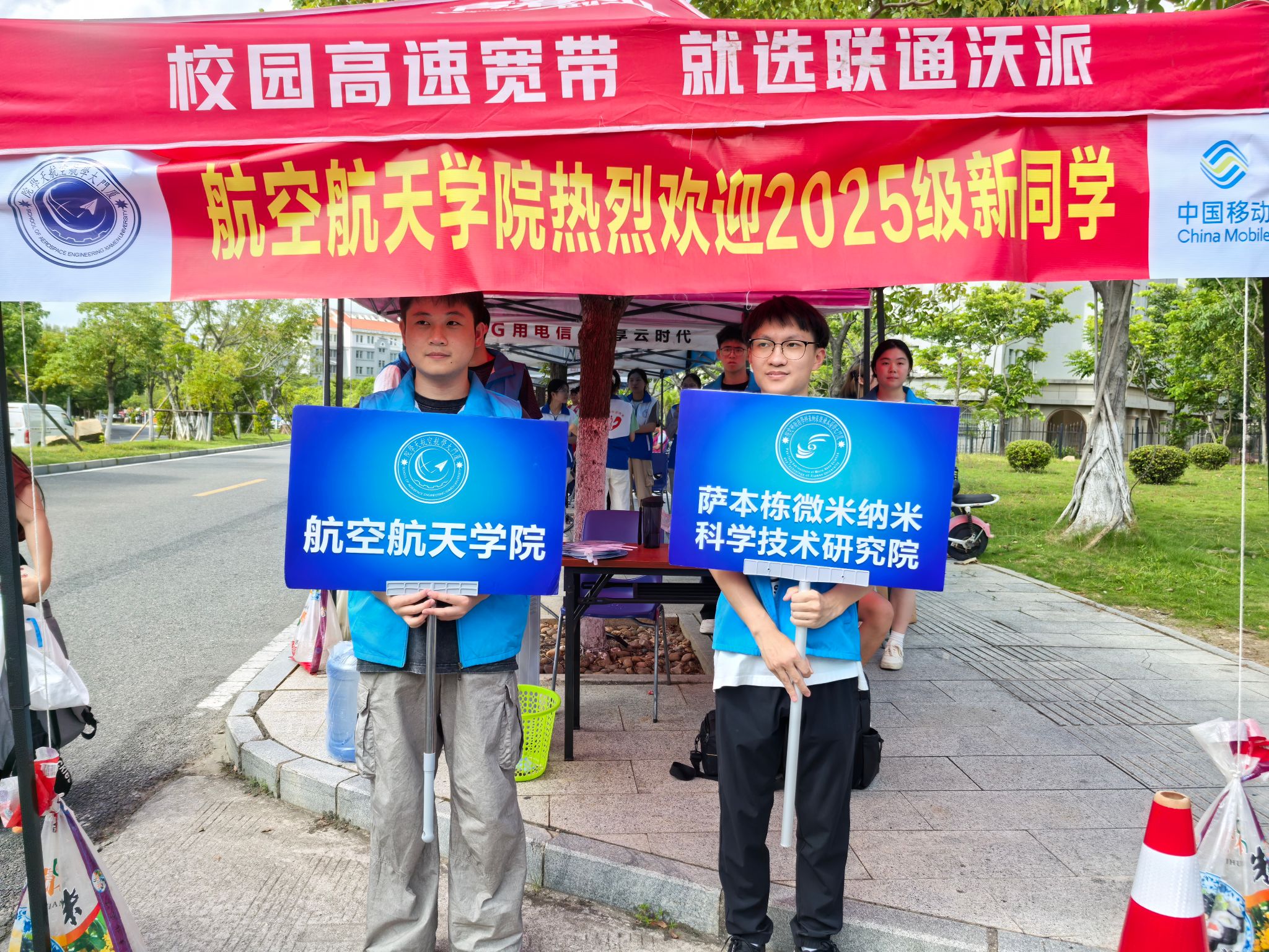 学院迎新点早早布置完毕,“航空航天学院热烈欢迎2025级新同学”的标语醒目而热烈。志愿者们穿梭于人群中,细致引导、热情服务,让新生们的“空天首航”温暖又顺畅。