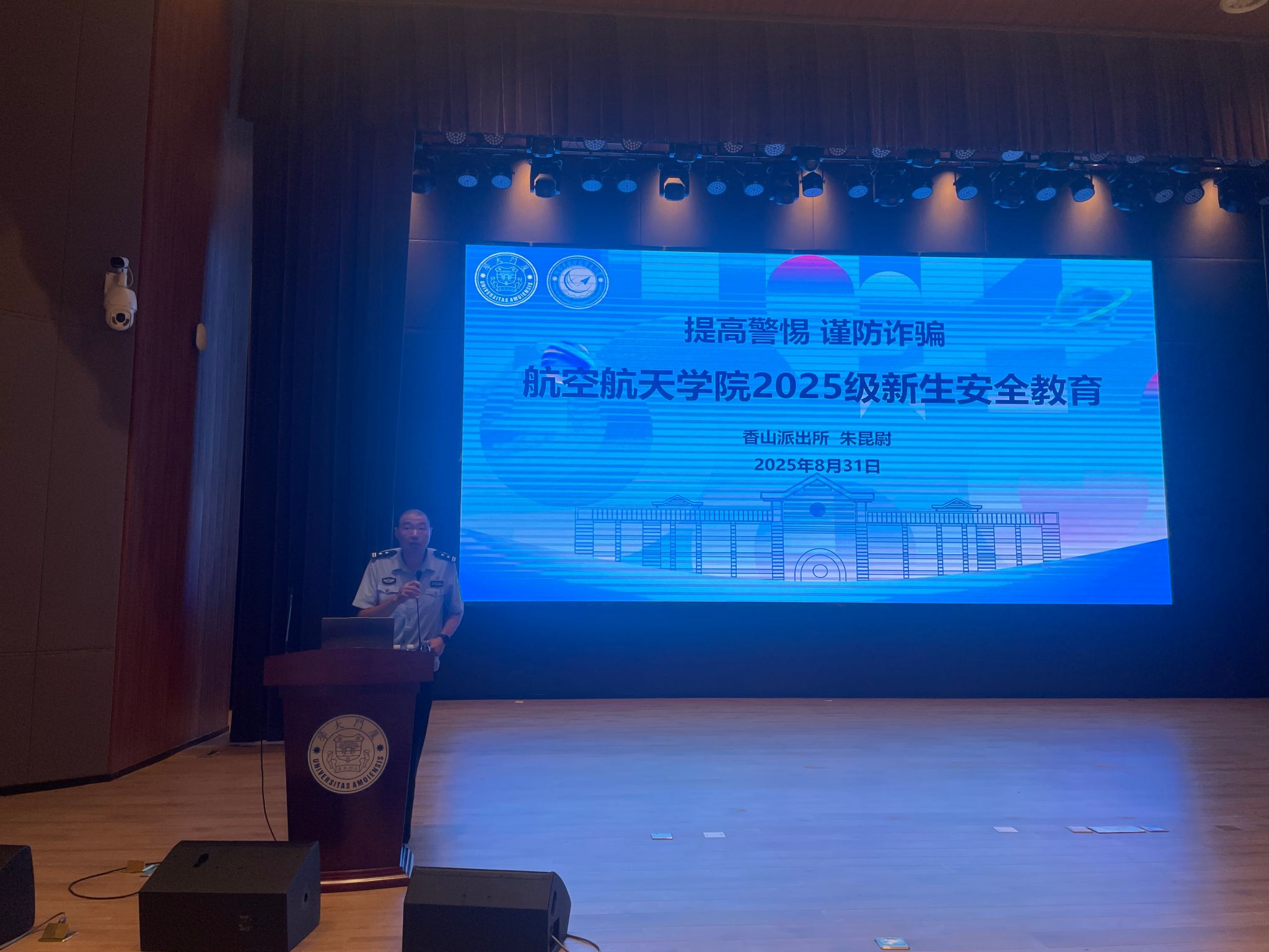 在信息化与数字化高速发展的当下,新型诈骗手段不断翻新、潜藏风险,既威胁大学生的财产安全,更对校园生活的和谐安定构成挑战。筑牢反诈防线、提升学生防范意识,已成为当前校园安全工作的迫切需求。8月31日上午,航空航天学院邀请翔安区香山派出所朱昆尉警官,在西部片区3号报告厅为全体2025级新生开展防诈骗专题安全教育讲座,学院党委副书记王寒主持讲座。