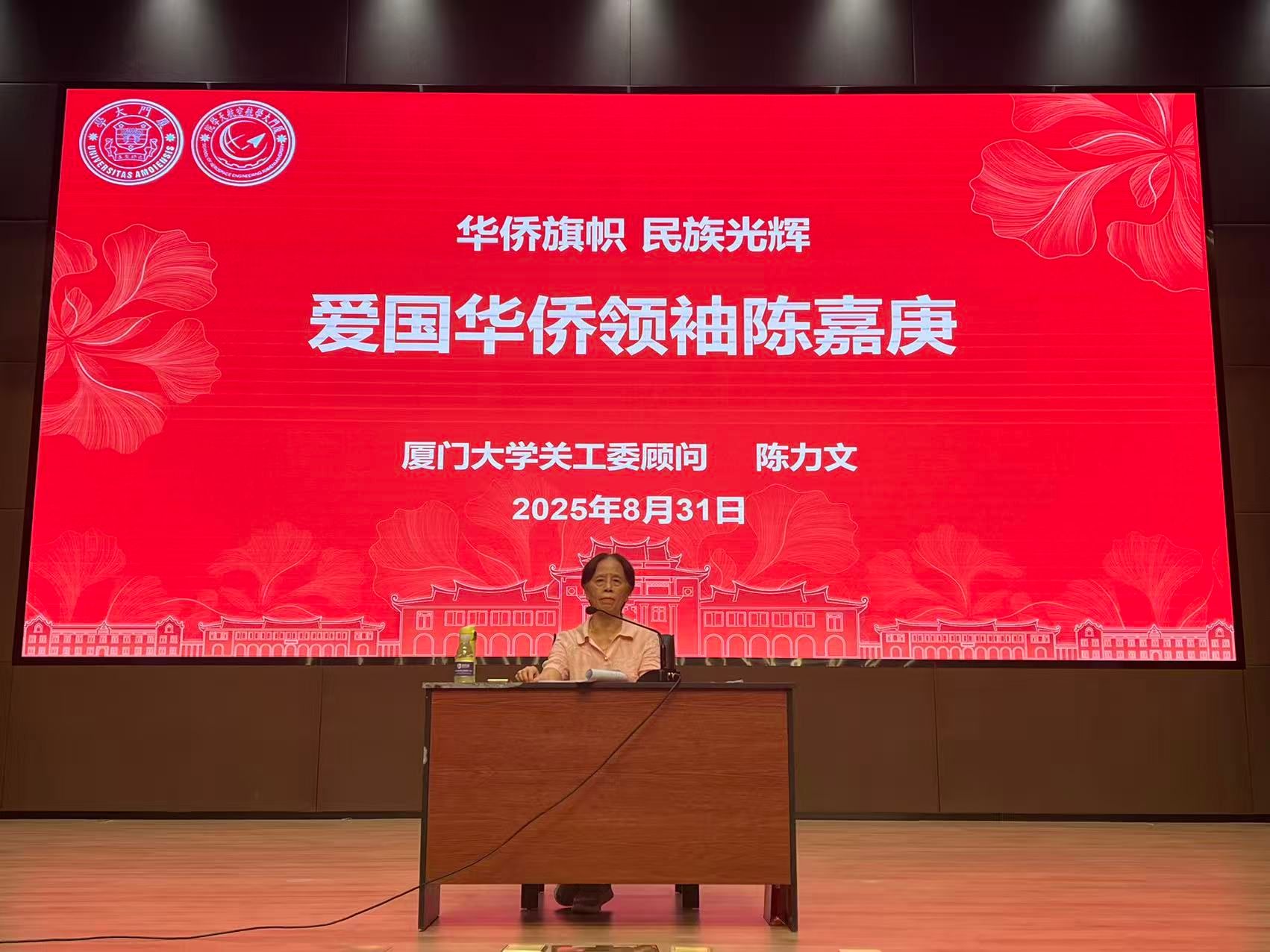 陈力文以“华侨旗帜 民族光辉——爱国华侨领袖陈嘉庚”为主题,结合详实史料与鲜活事例,系统梳理了陈嘉庚先生投身辛亥革命、兴学育才、抗日救亡、支援解放及建设新中国的光辉人生历程,深入阐释了其“忠公、诚毅、勤俭、创新”的精神内核。她特别提及,陈嘉庚先生获三代国家领导人的高度肯定,被毛泽东同志誉为“华侨旗帜、民族光辉”,这一评价成为镌刻在厦大精神丰碑上的永恒印记。