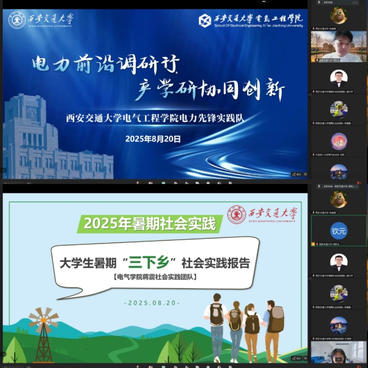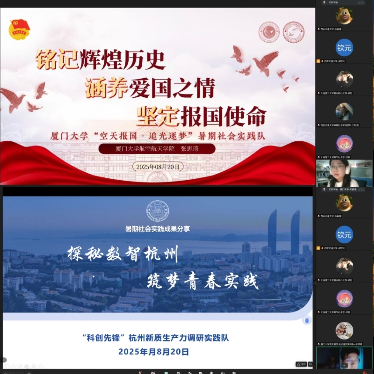 为深化校际实践资源共建共享、强化合作联动,近日,厦门大学航空航天学院联合西安交通大学电气工程学院、大连理工大学电气工程学院,以线上形式举办暑期社会实践成果交流分享会。活动聚焦科技创新、产学研深度融合两大主题,集中展示六支实践队在航空航天、电气工程、智能机器人、乡村产业升级等领域的调研成果与实践感悟。西安交通大学电气工程学院团委书记刘涛、大连理工大学电气工程学院团委书记郭凯名、厦门大学航空航天学院团委副书记董佳闻出席活动,西安交通大学电气工程学院咸钦元主持会议。