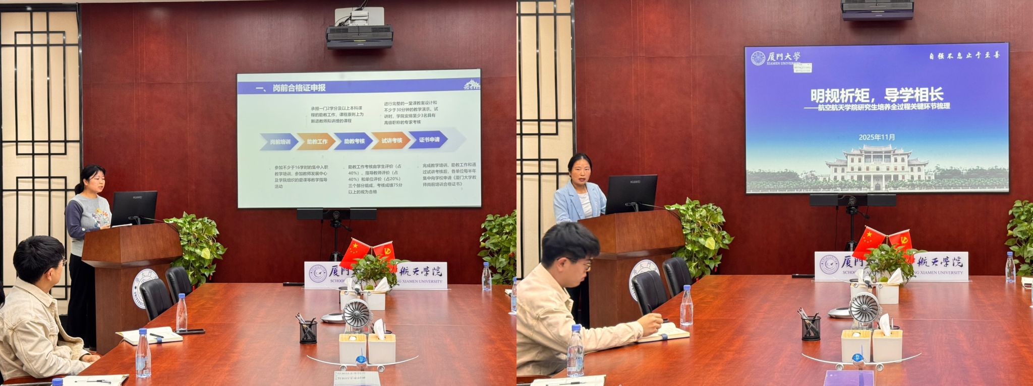 为帮助青年教师全面了解教学管理流程、尽快熟悉教学规范、胜任教书育人岗位,11月26日下午,航空航天学院青年教师“扶摇成长・蓄能启航”第二期培训在学院501会议室举行。本次培训由学院教学秘书团队牵头,围绕本科与研究生培养关键环节展开系统讲解。学院党委副书记王寒、行政支撑中心相关负责人及青年教师代表齐聚一堂,共同参与学习交流。学院副院长王奕首主持培训。