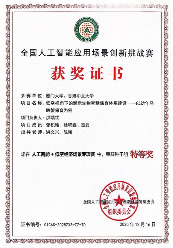 12月16日,第三届全国人工智能应用场景创新挑战赛人工智能+低空经济(文昌)专项晋级赛在海南省文昌市国家遥感卫星应用产业综合信息与服务平台中心圆满落幕。我院洪文兴教授与香港中文大学无人系统研究组联合指导的博士生洪端钦凭借《低空视角下的濒危生物智慧保育体系建设——以幼年马蹄蟹保育为例》项目脱颖而出,斩获种子组特等奖。该项目面向沿海生态保护的重大需求,针对马蹄蟹这一旗舰物种提出“多模态无人机集群+AI识别+大语言模型”融合的智能保护技术体系,该体系可实现潮间带大范围自主巡测、生态威胁识别、动态适宜性建模及保护策略闭环管理,为我国乃至全球马蹄蟹保育提供创新解决方案。