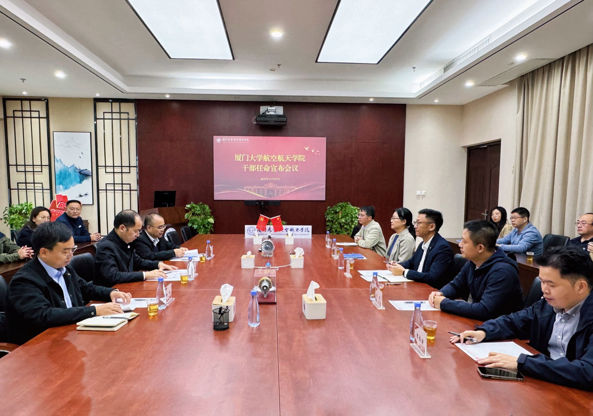12月19日上午,厦门大学航空航天学院干部任命宣布会议在学院501会议室召开。校党委常委、副校长尤延铖,校党委常委、组织部部长黎永强,航空航天学院党政领导班子成员、学院党委委员、部分专任教师及办公室全体人员参加会议。会议由黎永强主持。