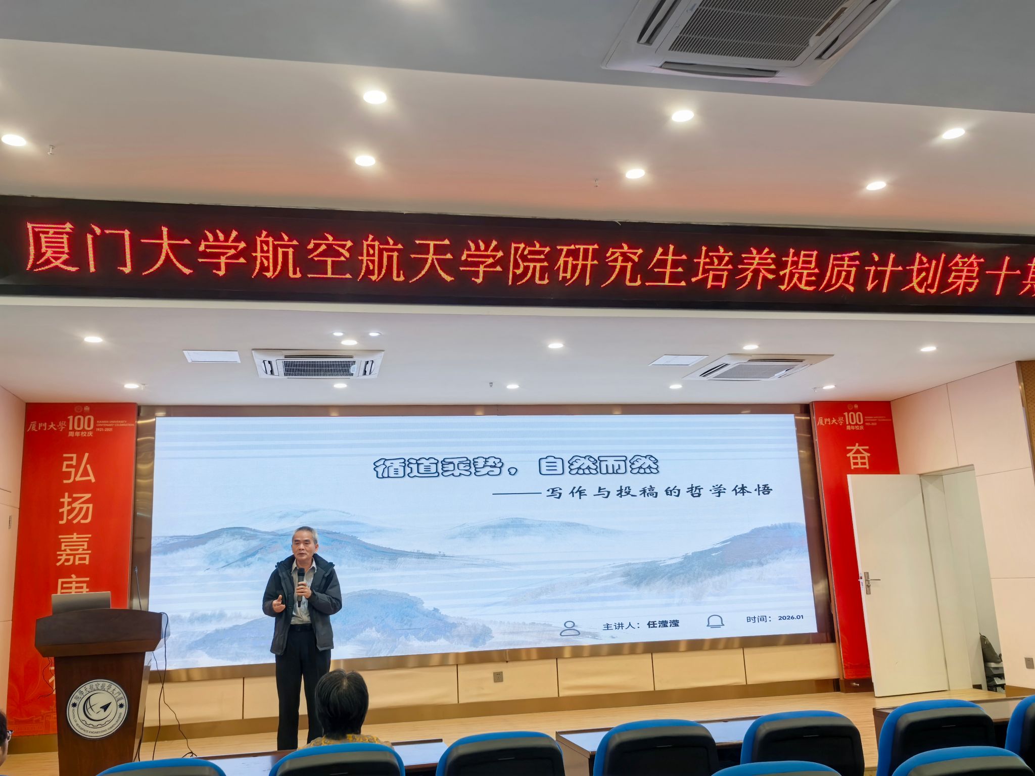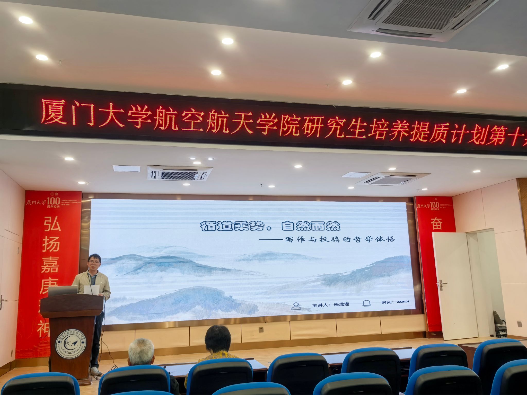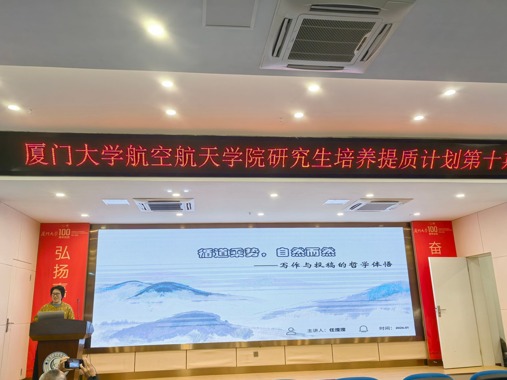 为破解研究生学术写作痛点,提升科研成果表达与发表能力,筑牢研究生培养质量根基,1月4日,航空航天学院于547报告厅举办研究生培养“提质计划”第十期活动。本期活动特邀《厦门大学学报(自然科学版)》副编审任莹莹作题为《循道乘势,自然而然——写作与投稿的哲学体悟》的讲座。学院副院长王奕首主持活动。
