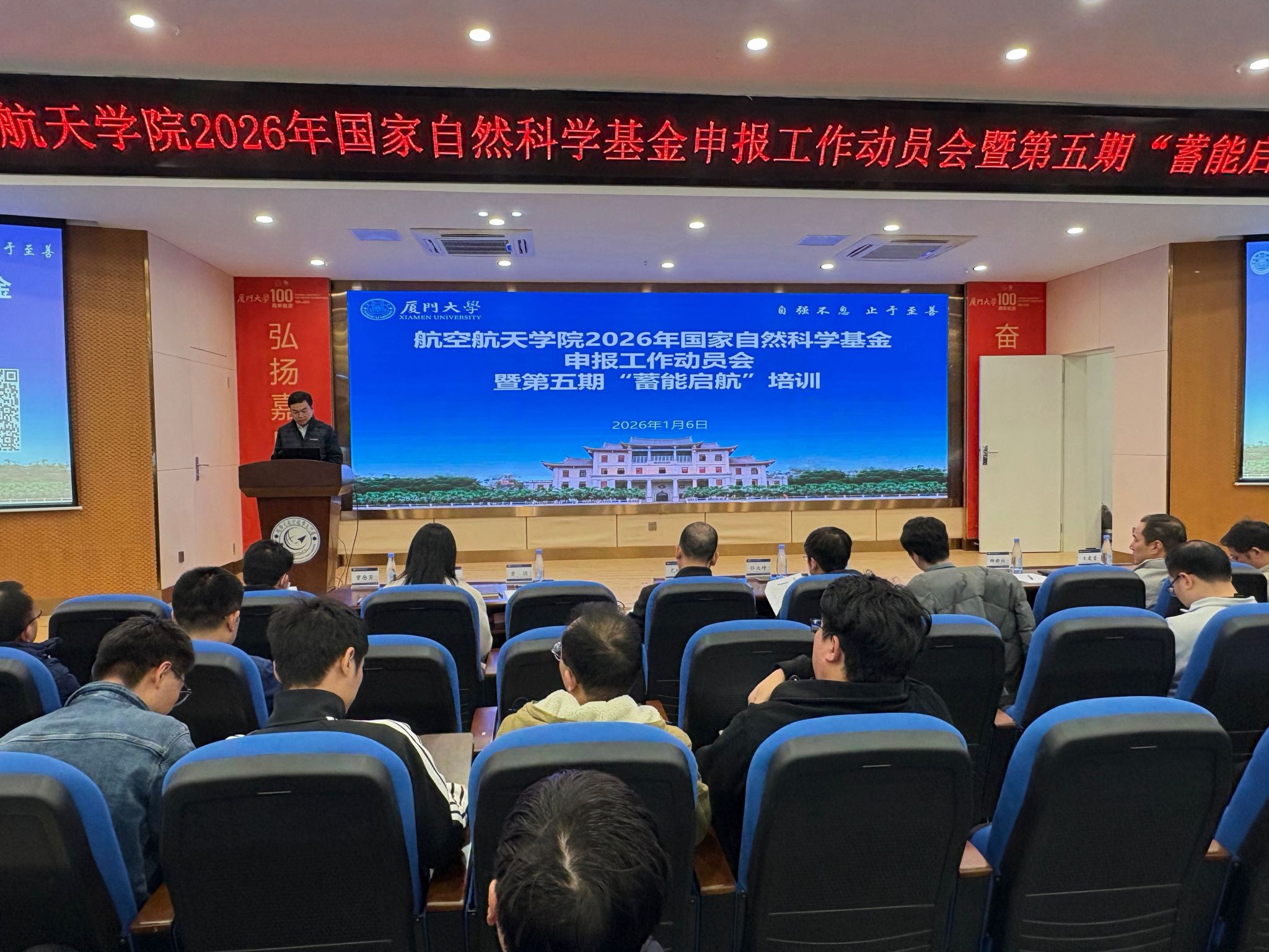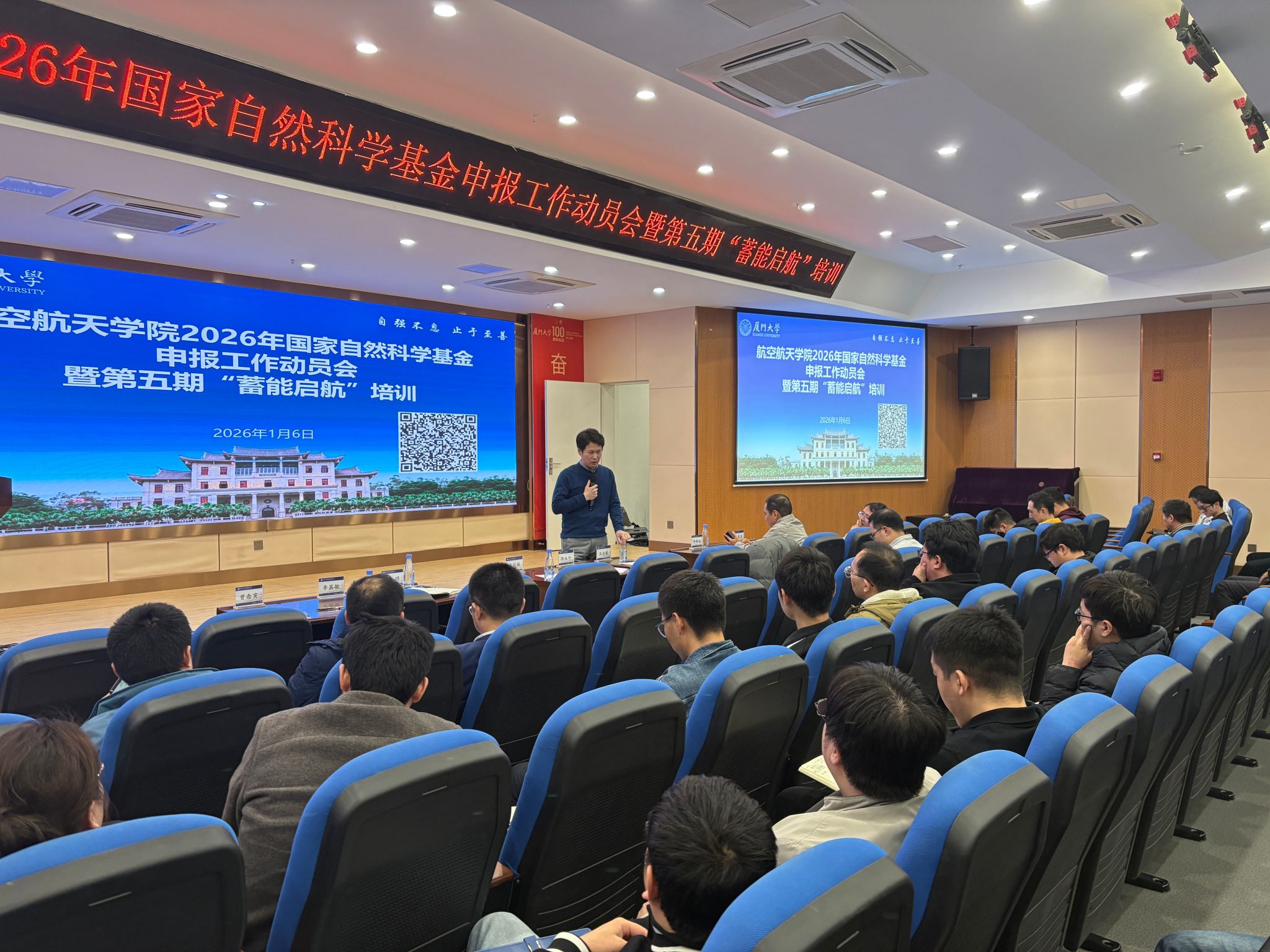 为深入贯彻国家科技创新战略部署,精准把握国家自然科学基金改革新导向,全面提升学院基金申报质量与核心竞争力,1月6日,航空航天学院召开2026年度国家自然科学基金申报动员会暨第五期“蓄能启航”培训。会议以“政策解读、经验传承、学术赋能、协同攻坚”为核心,特邀国内航空航天领域顶尖专家学者传经送宝,科技处专项解读申报政策,全院师生齐聚一堂,共谋基础研究突破之路。校党委常委、副校长尤延铖,副院长王奕首、曾念寅,国家高层次人才卿新林等参加会议。会议由黄玥院长主持。