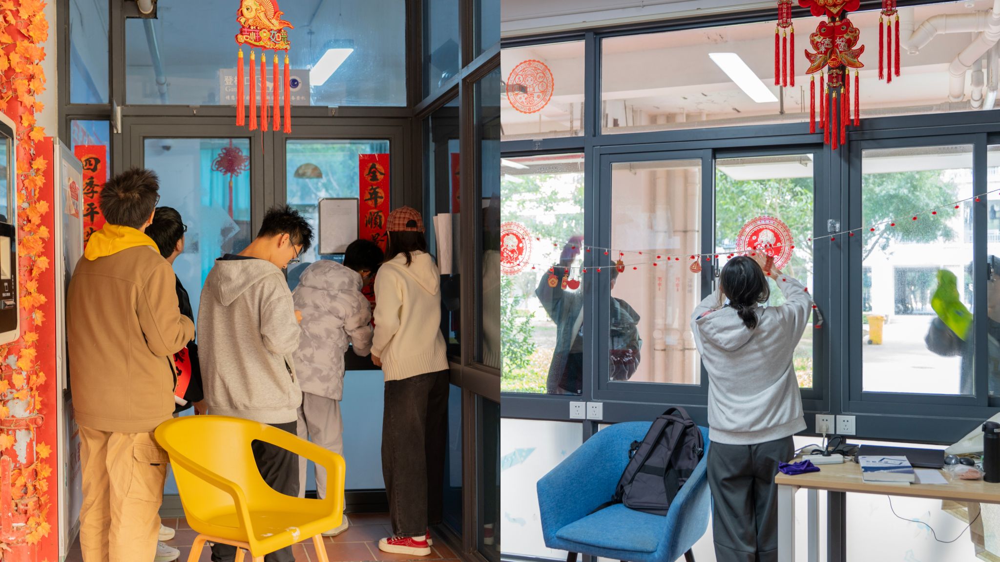 环境清洁完毕,“扮靓社区”环节紧接着拉开序幕。志愿者们精心将寓意吉祥的窗花贴满玻璃窗,把墨香浓郁的春联悬挂在门楣两侧,大红灯笼在空间各处高高挂起。原本简约现代的功能区,瞬间被浓浓的年味包裹,红色装饰与整洁环境相映成趣,既彰显了传统文化魅力,更传递出温暖祥和的新春气息。