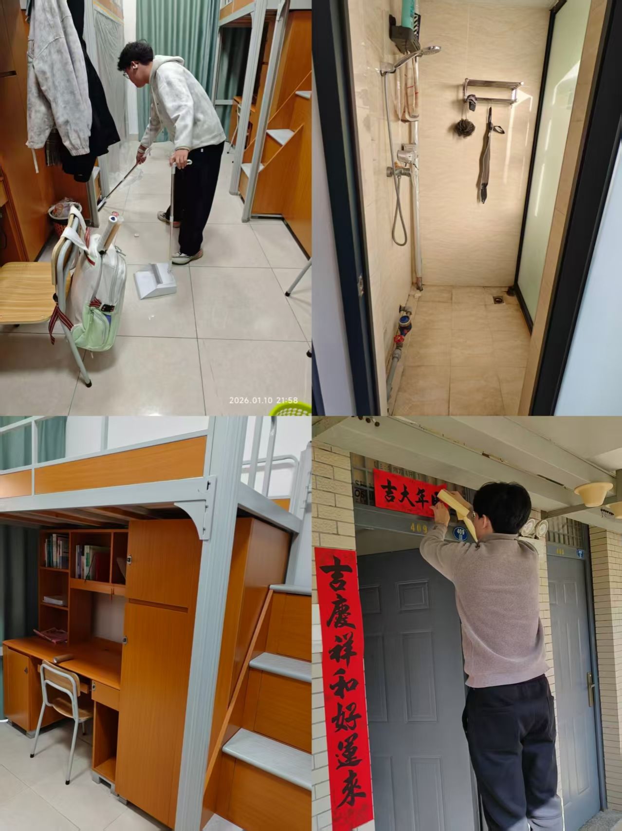 与此同时,“除尘布新”的倡议也深入学生宿舍生活区。同学们以宿舍为单位,协同合作,开启“宿舍焕新计划”。从整理书桌床铺、清扫阳台地面,到归纳个人物品、清除卫生死角,大家不放过一处细节。不少宿舍还发挥创意,自发张贴春联、悬挂福字、点缀红色装饰,在劳动中增进协作、凝聚情谊,让宿舍不仅整洁明亮,更充满了独特的“家”的温度与节日氛围。