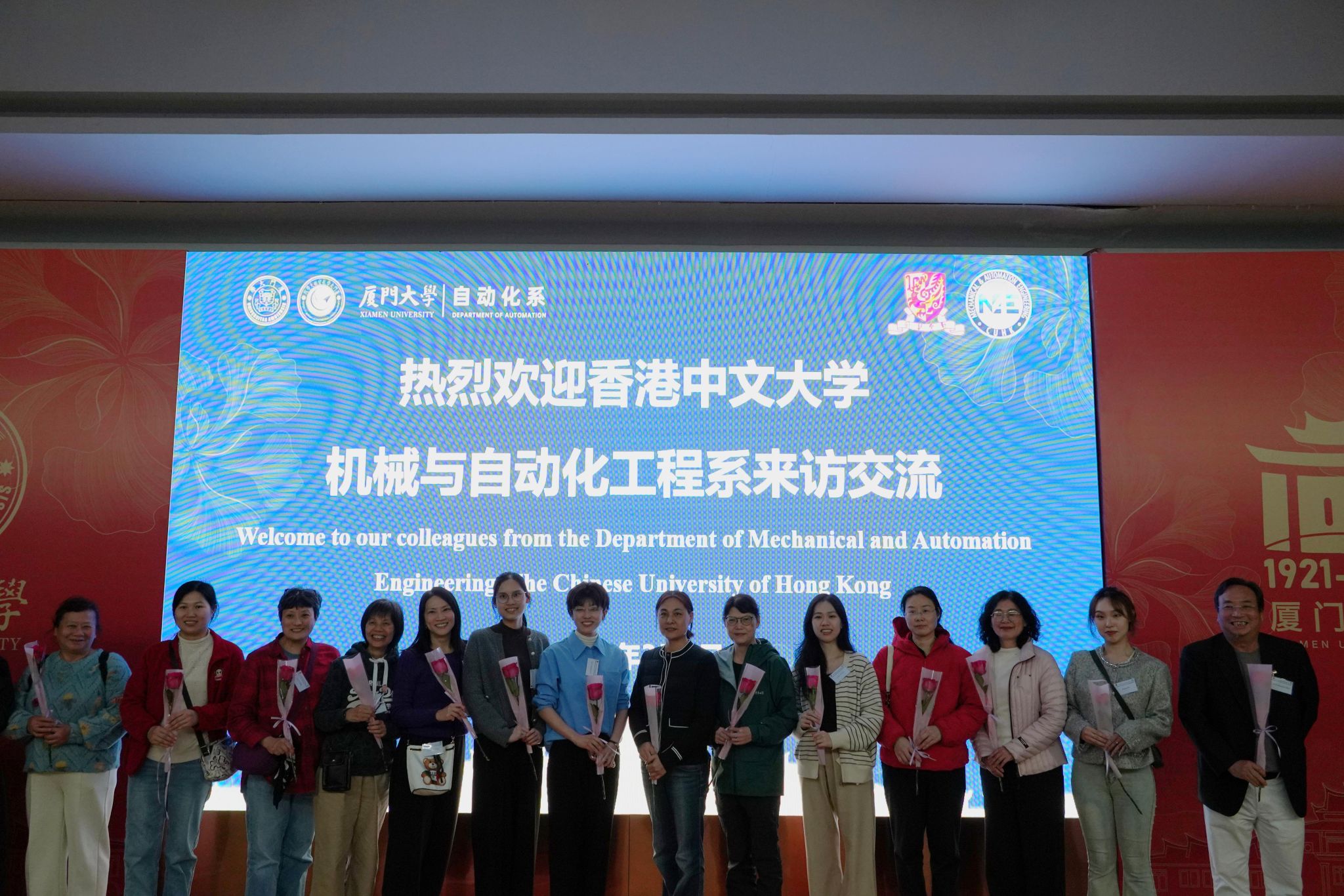 会上,新加坡工程院院士、厦门大学控制专业79级校友、香港中文大学陈本美教授介绍了香港中文大学、工程学院及机械与自动化工程学系的整体情况。厦门大学航空航天学院自动化系主任洪文兴教授介绍了我校自动化系的发展历程与学科特色。黄玥在致辞时表示,期待双方在智能系统与控制领域深化合作,建立人才培养、技术攻关、学术互访的长效机制。研讨环节,双方教师代表依次分享研究方向与最新成果,展开充分交流,为后续合作奠定基础。研讨会尾声,双方互赠纪念品,并在“三八”国际妇女节来临之际,向在场女教师献上鲜花,致以节日的美好祝福。