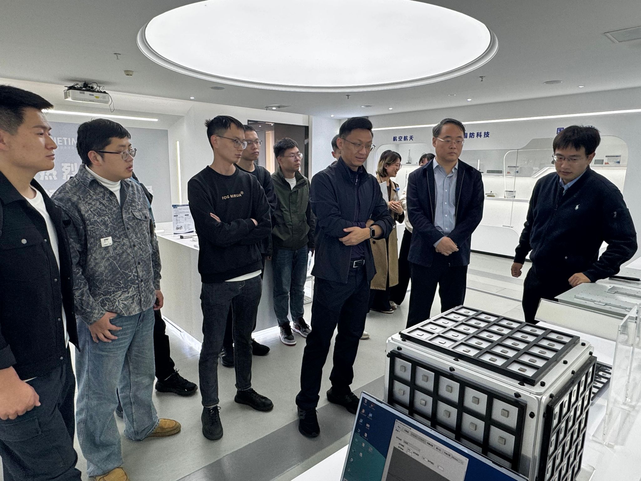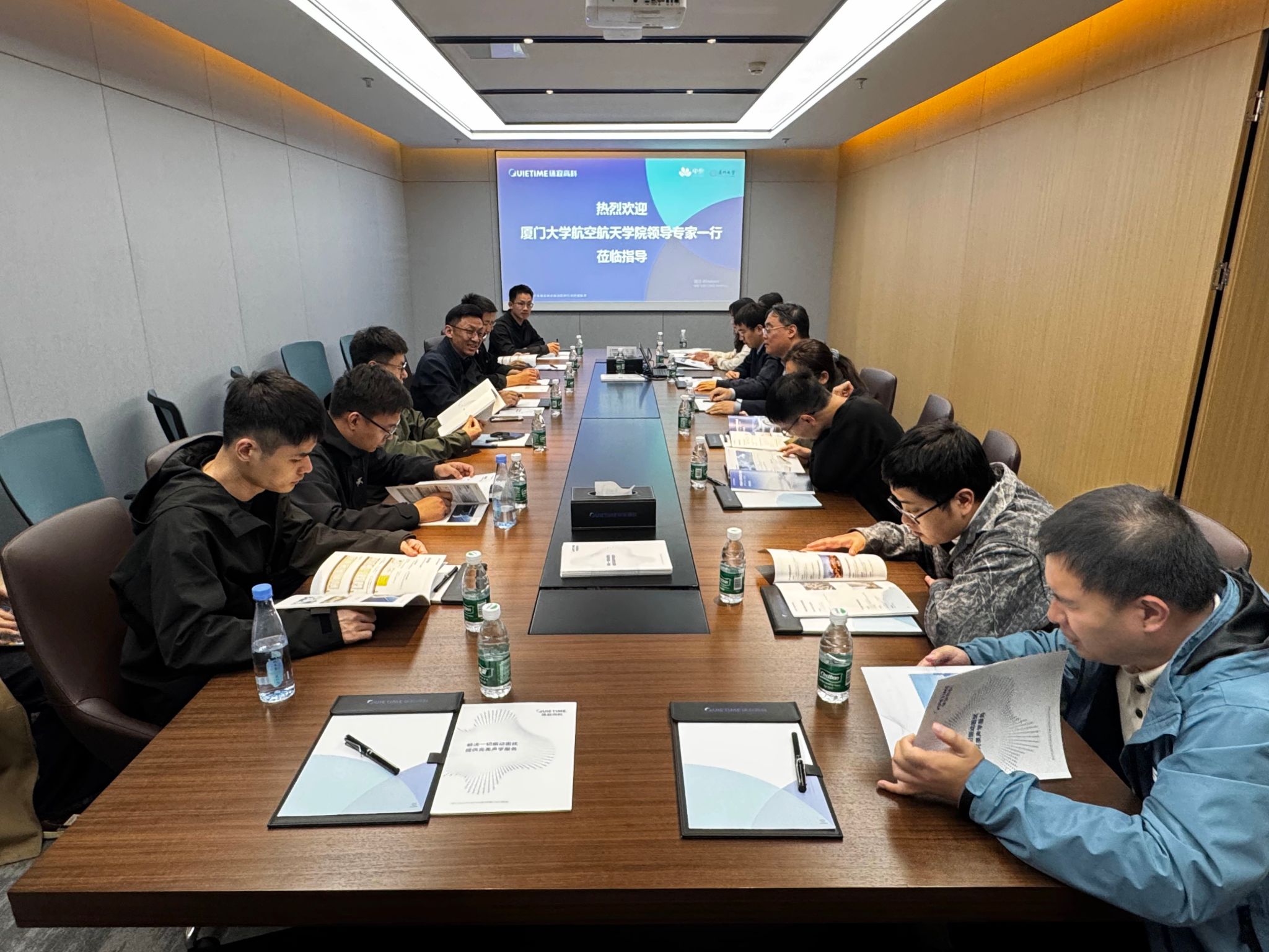 随后,参访团前往厦门环寂高科有限公司开展第二站探访。环寂高科由学院肖望强教授团队与央企中国中化控股有限责任公司联合孵化创办,其核心技术——粒子阻尼减振降噪技术,是源自航空航天领域的硬核黑科技。凭借这项核心技术,团队成功研制出站箭降冲用阻尼盒,为长征五号B运载火箭和载人空间站分离提供了关键技术保障;该技术还成功应用于高铁“静音车厢”,让时速350 公里的高铁实现“飞驰无声”,完美诠释了航天技术跨界赋能的无限可能。