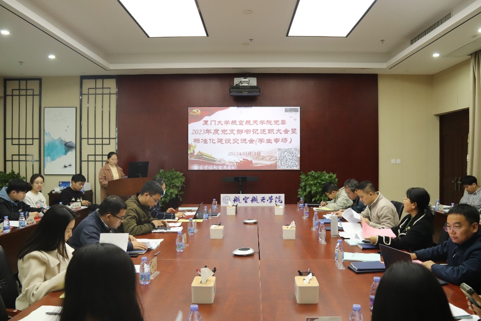 学生专场于3月11日在航空航天学院501会议室以“一述一评”的方式展开。会上,23位学生党支部书记围绕思想政治工作、党建重点任务、支部党建责任制、支部标准化建设等方面依次进行现场述职汇报,通过图片、数据和文字等形式展示一年来抓支部党建工作的成效;对各自支部特色活动进行了详细介绍,并针对支部存在的问题和不足提出了改进方案。每位支部书记述职后,由联系该支部的党委委员进行点评,在肯定支部党建工作特色和成绩的同时,也指出存在的不足并提出具体改进意见。