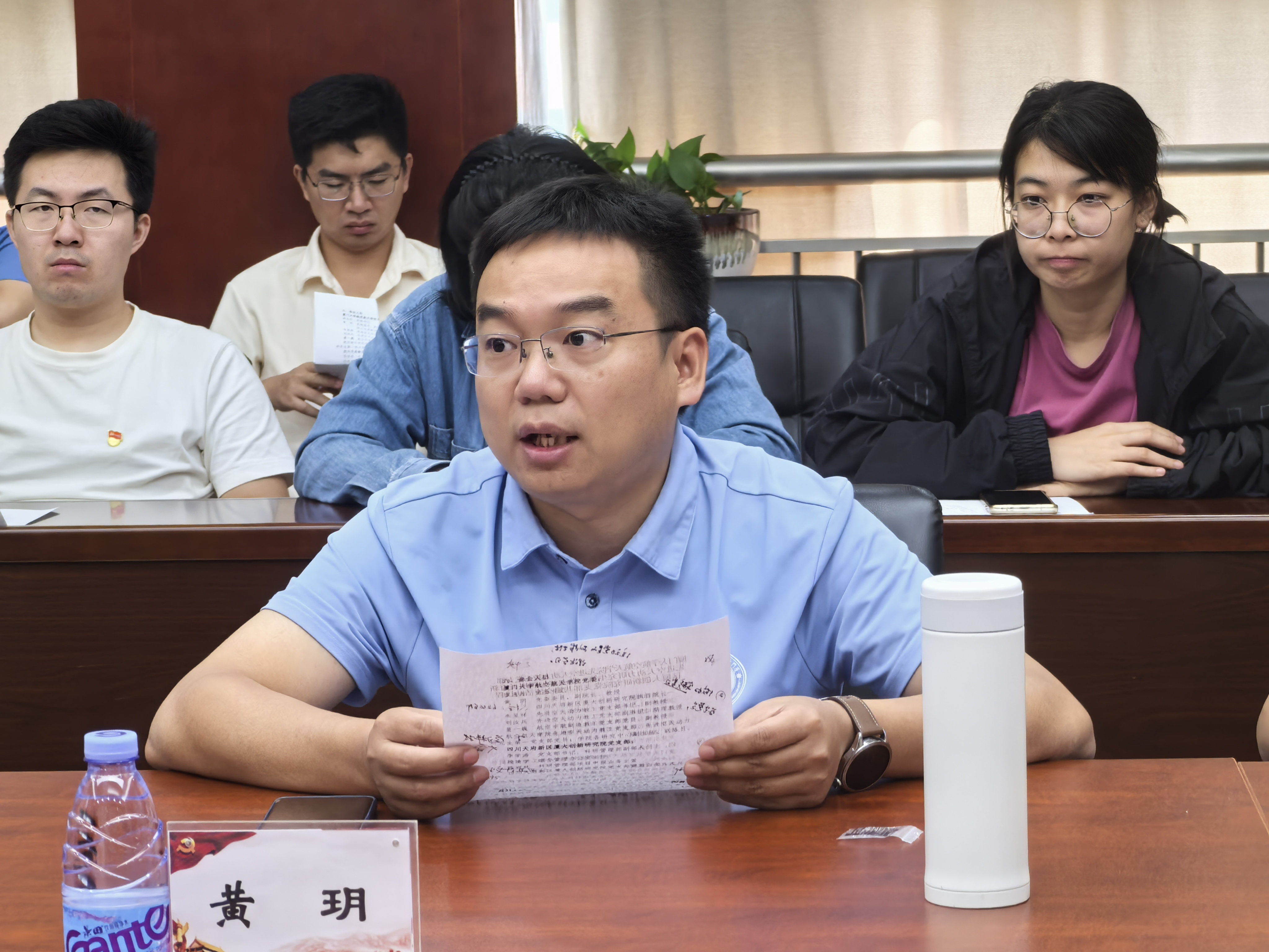 航空宇航制造教工党支部党员董一巍副教授从厦门大学与四川省在航空航天领域进行产学研合作的各自优势和有利条件出发,分享了他所在团队与四川省内相关科研机构、企业联合申报国家重点研发项目的经验,并鼓励学院各团队要进一步加强与研究院的联系交流,共同攻关高温合金材料应用、热管理技术等关键瓶颈技术,服务于航空发动机产业链的高端需求。