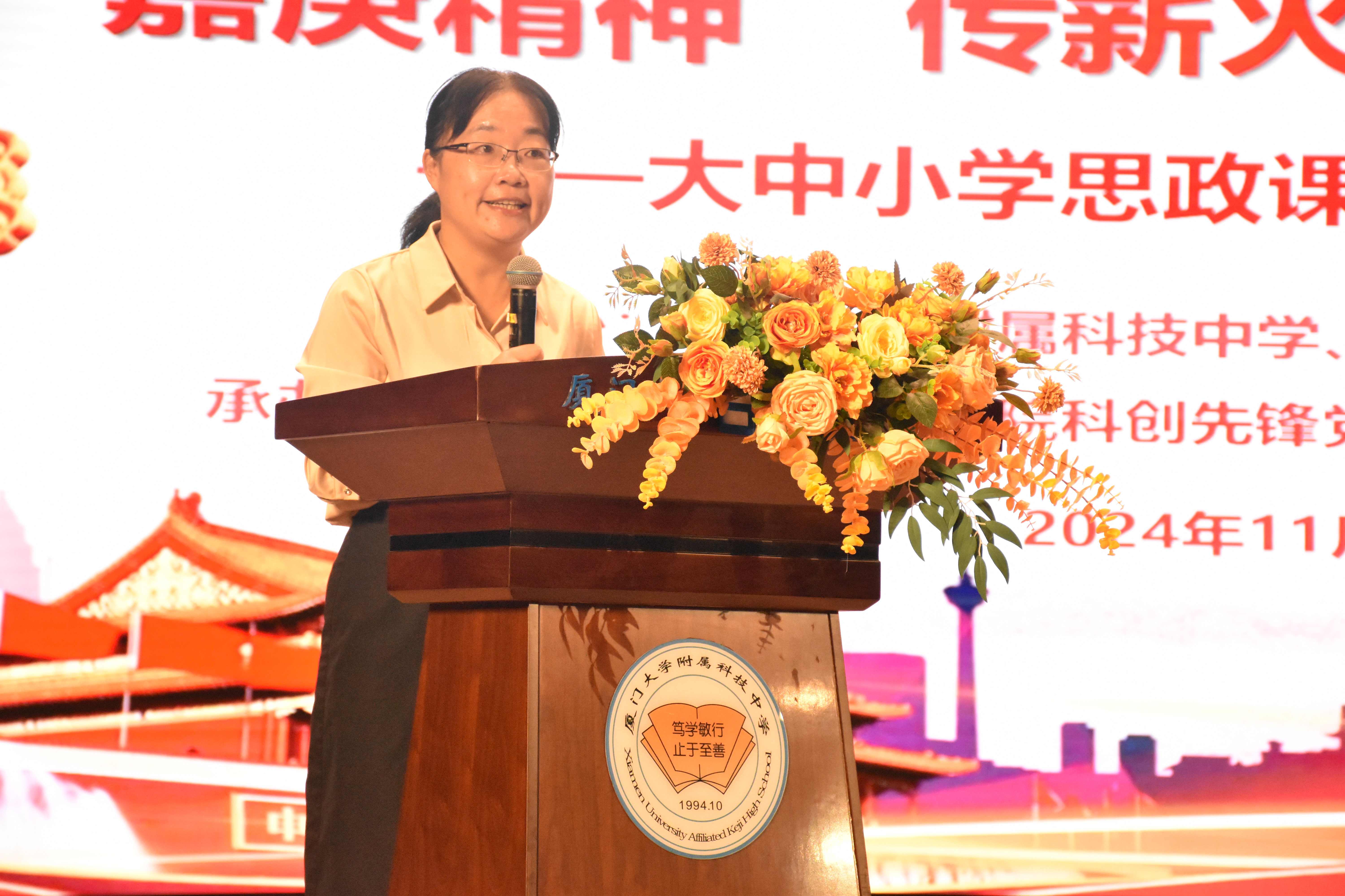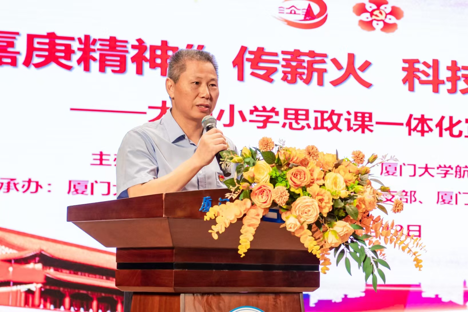 詹功祚为本次活动致开幕词。詹功祚表示,深入推进大中小学思政课一体化建设,关系到“培养什么人、怎样培养人、为谁培养人”这个教育的根本问题。长期以来,科技中学与厦门大学在开展思政教育、科技竞赛等方面保持着密切友好的合作关系,特别与厦门大学航空航天学院、厦门大学扬才先锋党支部开展了多场走心出“新”、反响热烈的思政“金课”。希望本次共建活动能够进一步拓展大中小学思政课堂,帮助科技中学学子进一步开拓航空航天视野、聚合科技报国力量,成长为让党放心、爱国奉献、担当民族复兴大任的时代新人。
