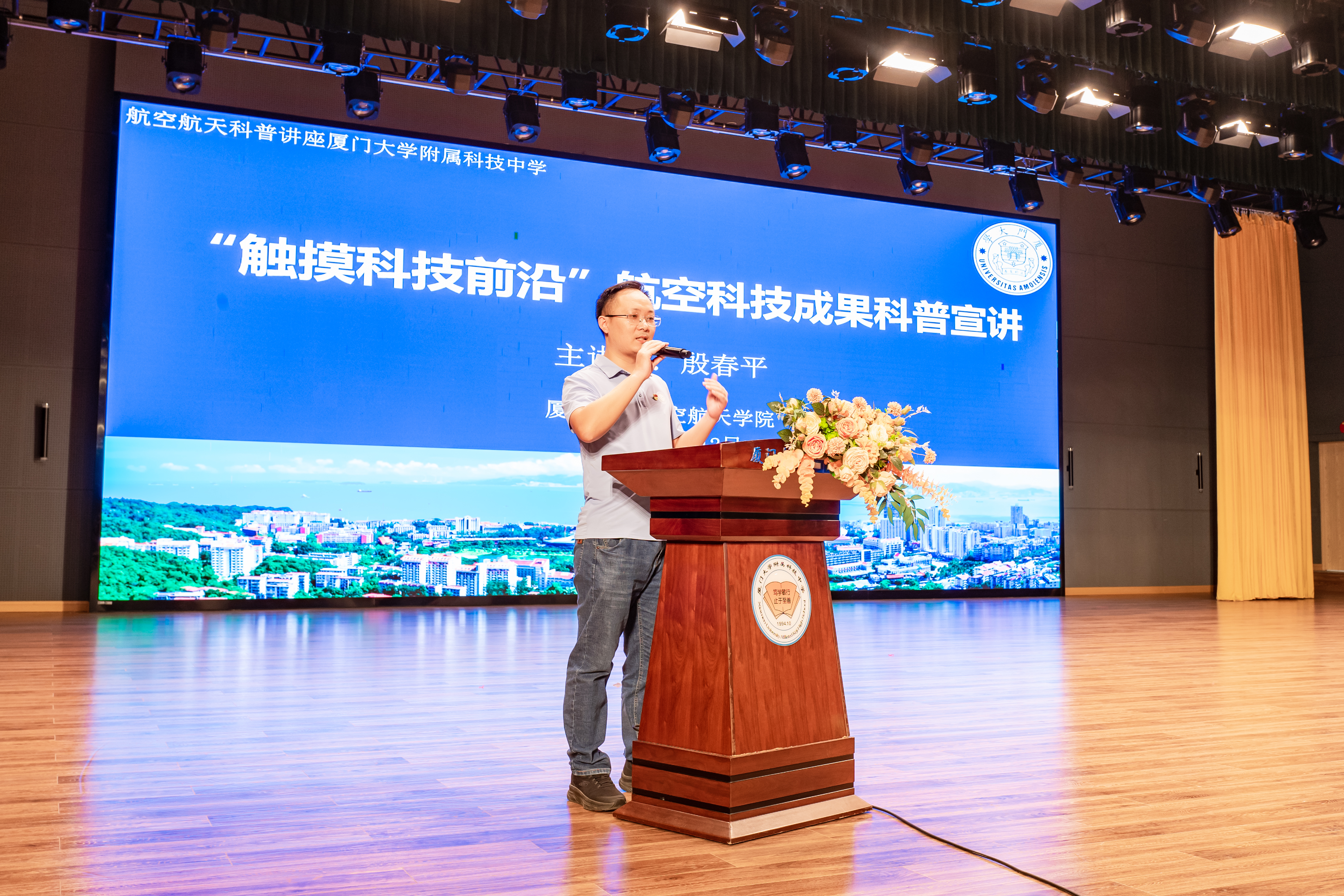 在“触摸科技前沿”环节,殷春平作为科创先锋党支部的红色导师,为同学们带来了航空科技成果科普宣讲。他以厦门大学航空航天学院创新研制、成功发射“本栋”系列火箭的纪实视频引入,用通俗易懂、妙趣横生的语言分享了厦大青年学子在科技创新、成果转化方面的最近进展,带领大家体验科技前沿脉搏,感受空天科技魅力。