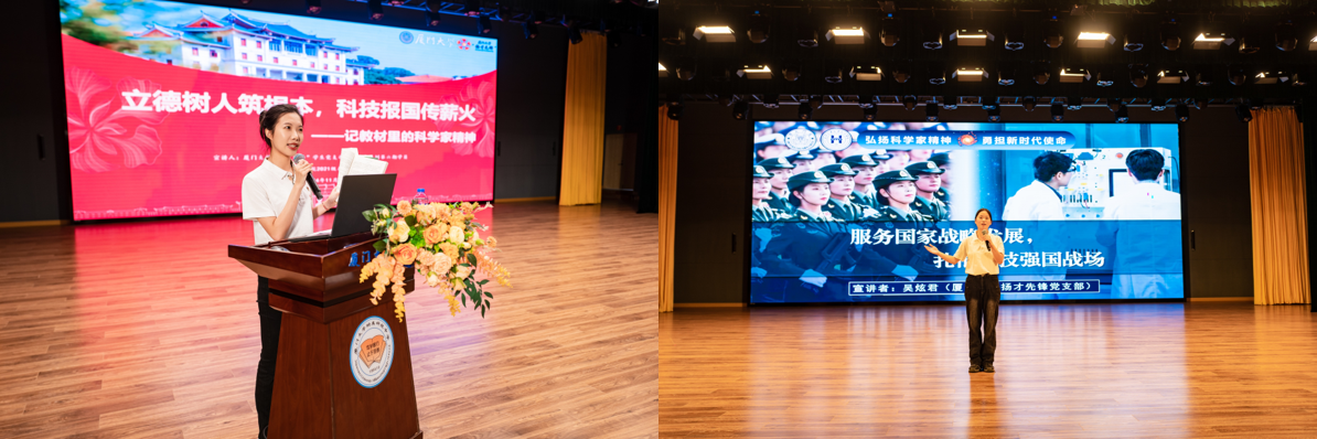 本次活动分为“立志科技报国”“触摸科技前沿”“放飞科技梦想”“共话思政未来”四部分。在“立志科技报国”环节,扬才先锋党支部成员以嘉庚精神、科技报国为引领,声情并茂地带来了两讲精彩生动的思政课。黄子馨同学以“立德树人筑根本 科技报国传薪火——记教材里的科学家精神”为题,从厦大校友谢希德院士的故事展开,鼓励青年学子要大力弘扬科学家精神,勇于创新、担当报国。吴炫君同学结合自身参军入伍的经历,生动诠释了“科技才是现代战争核心战斗力”这一重要论述,激励同学们要以青春磅礴之力助推高水平科技自立自强,在科技强国的战场中绽放光彩。